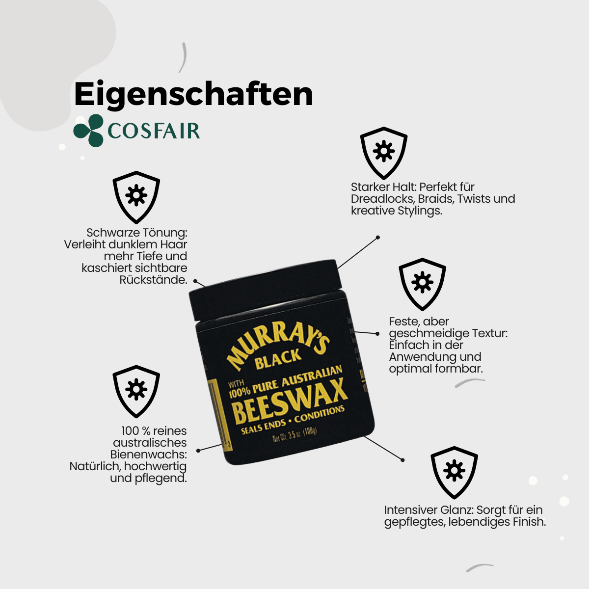Erleben Sie kraftvollen Halt, intensiven Glanz und eine tiefe schwarze Farbwirkung, die speziell entwickelt wurde, um dunkles Haar perfekt zu unterstützen. Murray’s Black 100% Pure Australian Beeswax ist die ideale Wahl für alle, die Dreadlocks, Braids, Twists, definierte Locken oder kreative Styles zuverlässig formen und fixieren möchten – ohne Kompromisse.