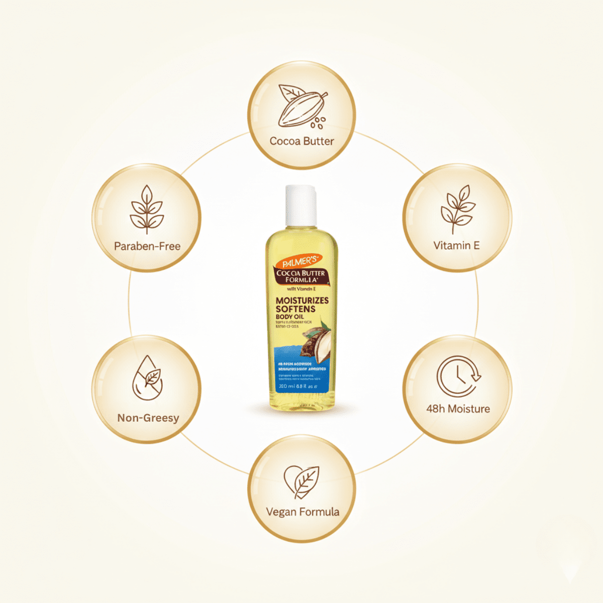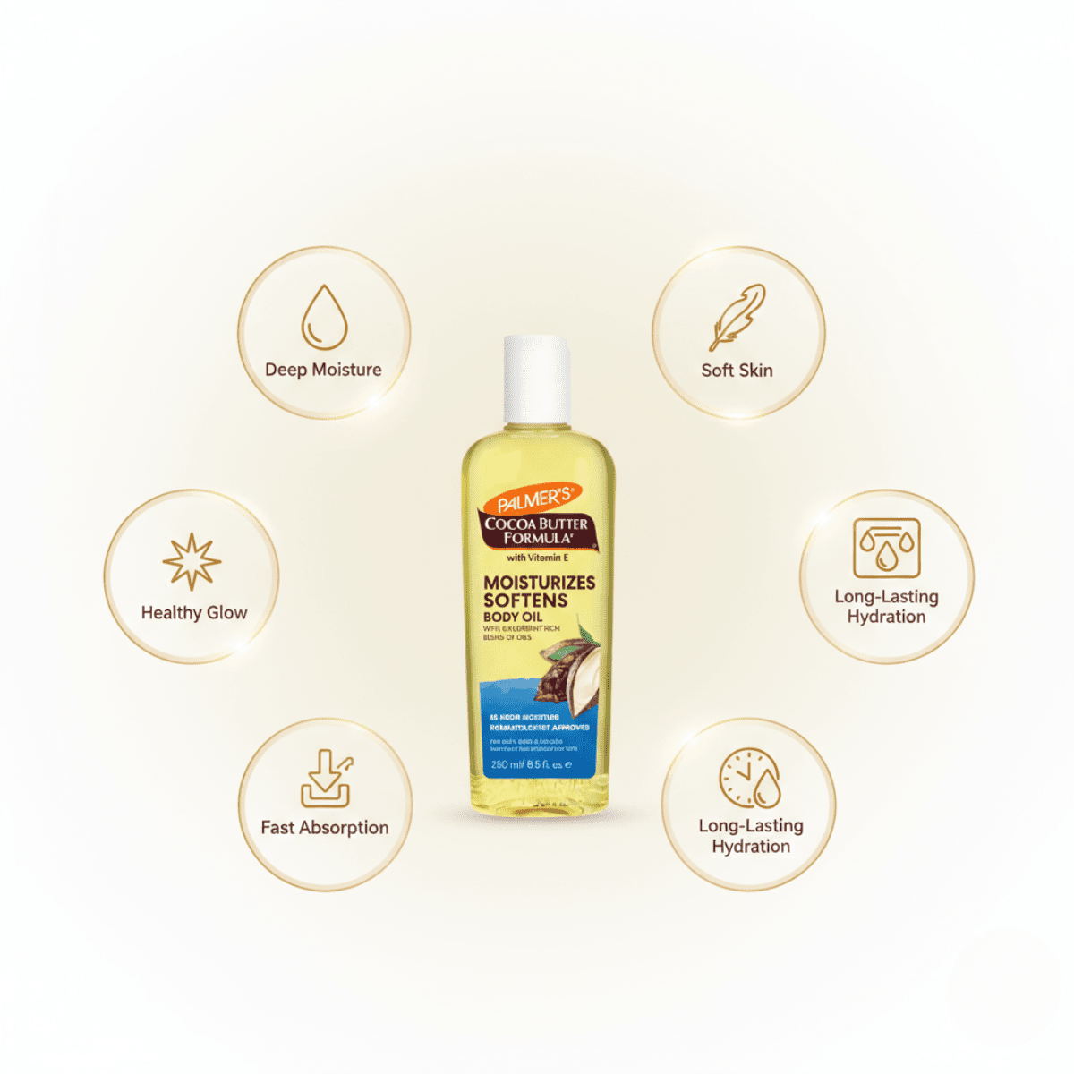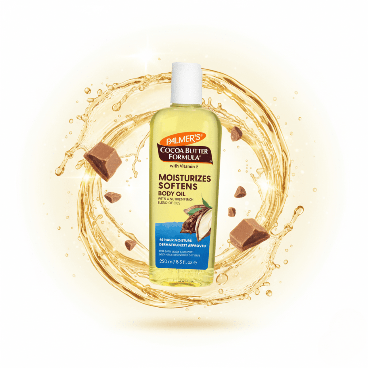 Die nicht fettende Formel lässt sich ideal mit der Palmer’s Cocoa Butter Body Lotion oder dem Original Solid Jar kombinieren, um deine Pflegeroutine individuell zu intensivieren.