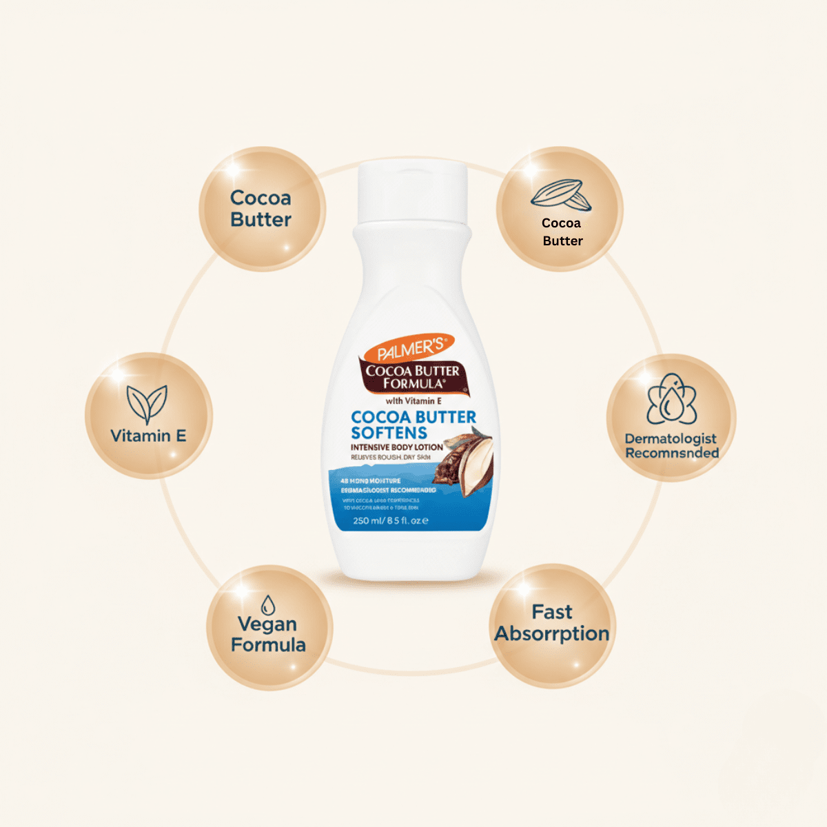 Wenn deine Haut trocken, rau oder beansprucht ist, braucht sie Pflege, die tiefenwirksam hilft. Die Palmer’s Cocoa Butter Formula Softens Intensive Body Lotion wurde entwickelt, um intensiv zu nähren, die Haut sichtbar zu glätten und ihr ein gesundes, gepflegtes Aussehen zu verleihen. Die reichhaltige, aber schnell einziehende Lotion versorgt die Haut lang anhaltend mit Feuchtigkeit und sorgt für sofortige Geschmeidigkeit – Tag für Tag.