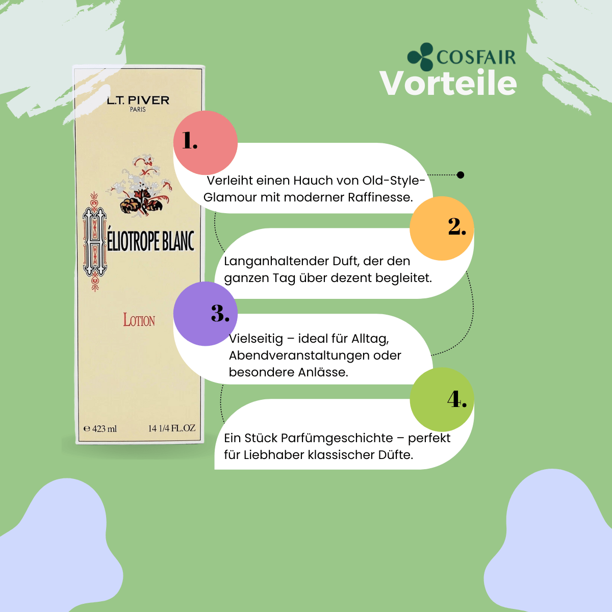 LT Piver Paris Heliotrope Blanc Perfume 423ml (Eau de Toilette) is a timeless fragrance jewel for women from 1850. This fragrance created by LT Piver has lost none of its appeal even after more than a century. Heliotrope Blanc is appreciated by stylish and mature ladies thanks to its distinguished scent notes of almond, vanilla, ylang ylang, jasmine and heliotrope. The elegant finish of the bottle reflects the timeless elegance of this fragrance. Strong yet not intrusive, the scent stays on the skin for about 6 hours.