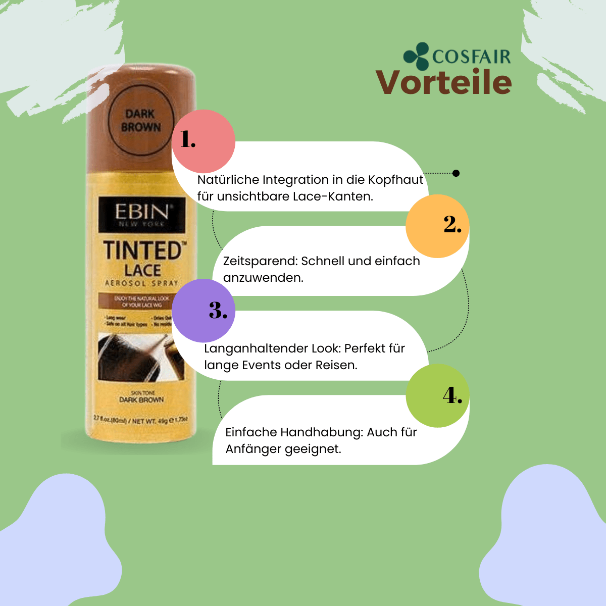 Ebin Tinted Lace Aerosol Spray Dark Brown – für natürliche, unsichtbare Lace-Kanten. Schnelltrocknend, wasserfest, präzise & vegan. Ideal für alle Lace-Front-Perücken.