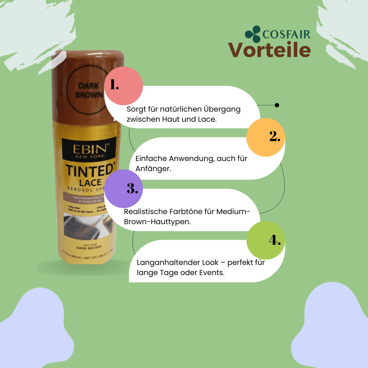 Ebin Tinted Lace Spray Medium Brown – nahtlose Farbanpassung für Lace-Fronts. Schnelltrocknend, wasserfest, präzise & vegan. Für einen unsichtbaren, natürlichen Perücken-Look.