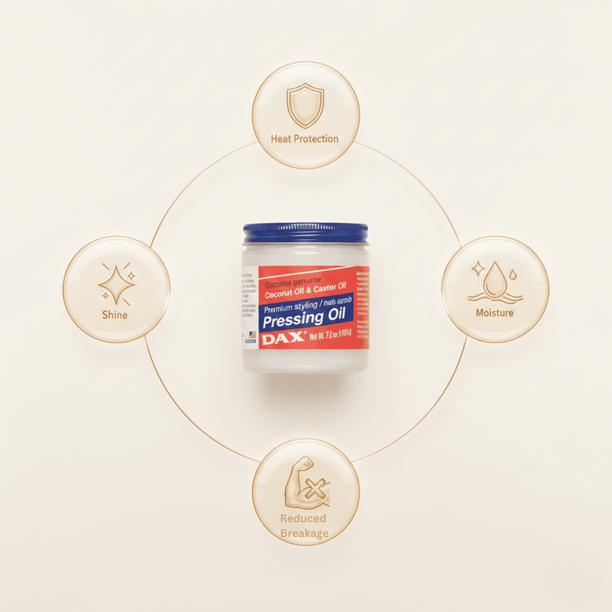 - Before styling, apply the desired amount of Dax Press Oil to the hair.