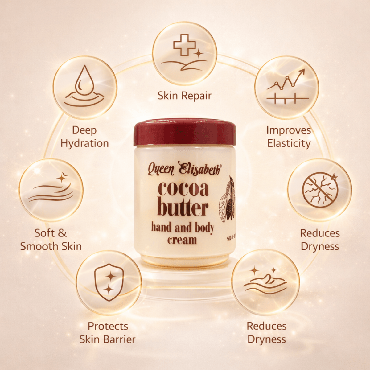 Queen Elisabeth Cocoa Butter Hand and Body Cream, with natural cocoa butter and pure lanolin, in a non-greasy, moisturising base. Protects against sun damage, especially for highly stressed skin. Helps restore essential moisture balance and prevents wrinkles, lines and crow's feet. Soothes and softens dry, irritated or cracked skin, possibly also to relieve stretch marks.