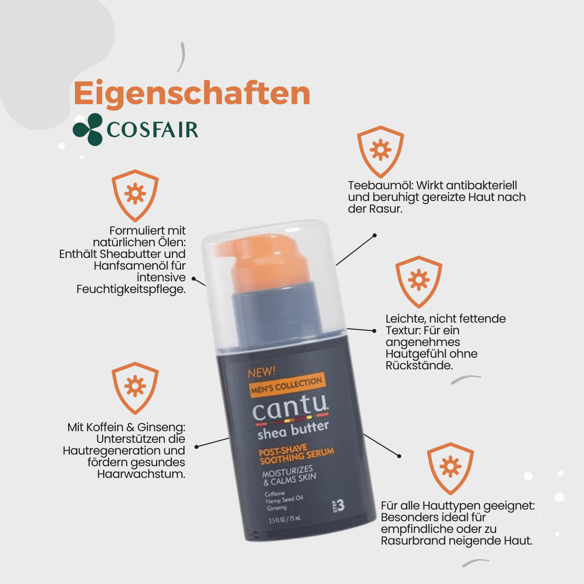 Nach der Rasur braucht Ihre Haut sofortige Linderung – und genau hier wirkt das Cantu Shea Butter Post-Shave Soothing Serum. Die Kombination aus Sheabutter, Hanfsamenöl, Teebaumöl, Koffein und Ginseng beruhigt irritierte Haut, versorgt sie intensiv mit Feuchtigkeit und schützt vor Rasurbrand. Das leichte Gel zieht schnell ein, hinterlässt kein Fettgefühl und schenkt ein spürbar kühles, vitalisiertes Finish.