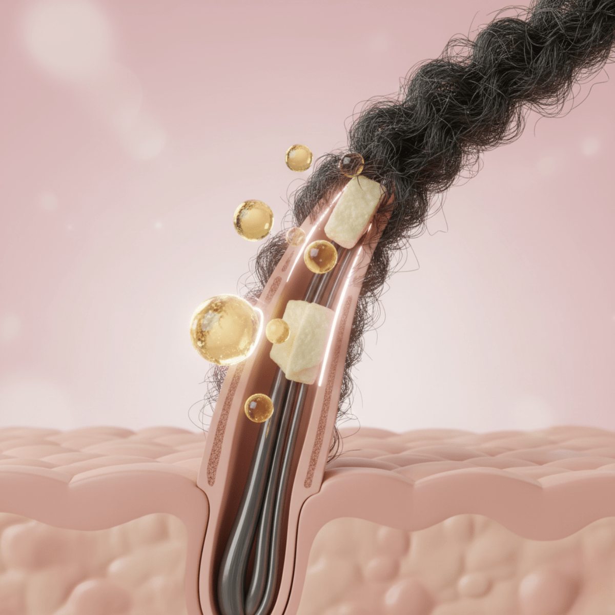 2️⃣ Bei dickem oder grobem Haar großzügiger verwenden und vom Ansatz bis in die Spitzen einarbeiten.