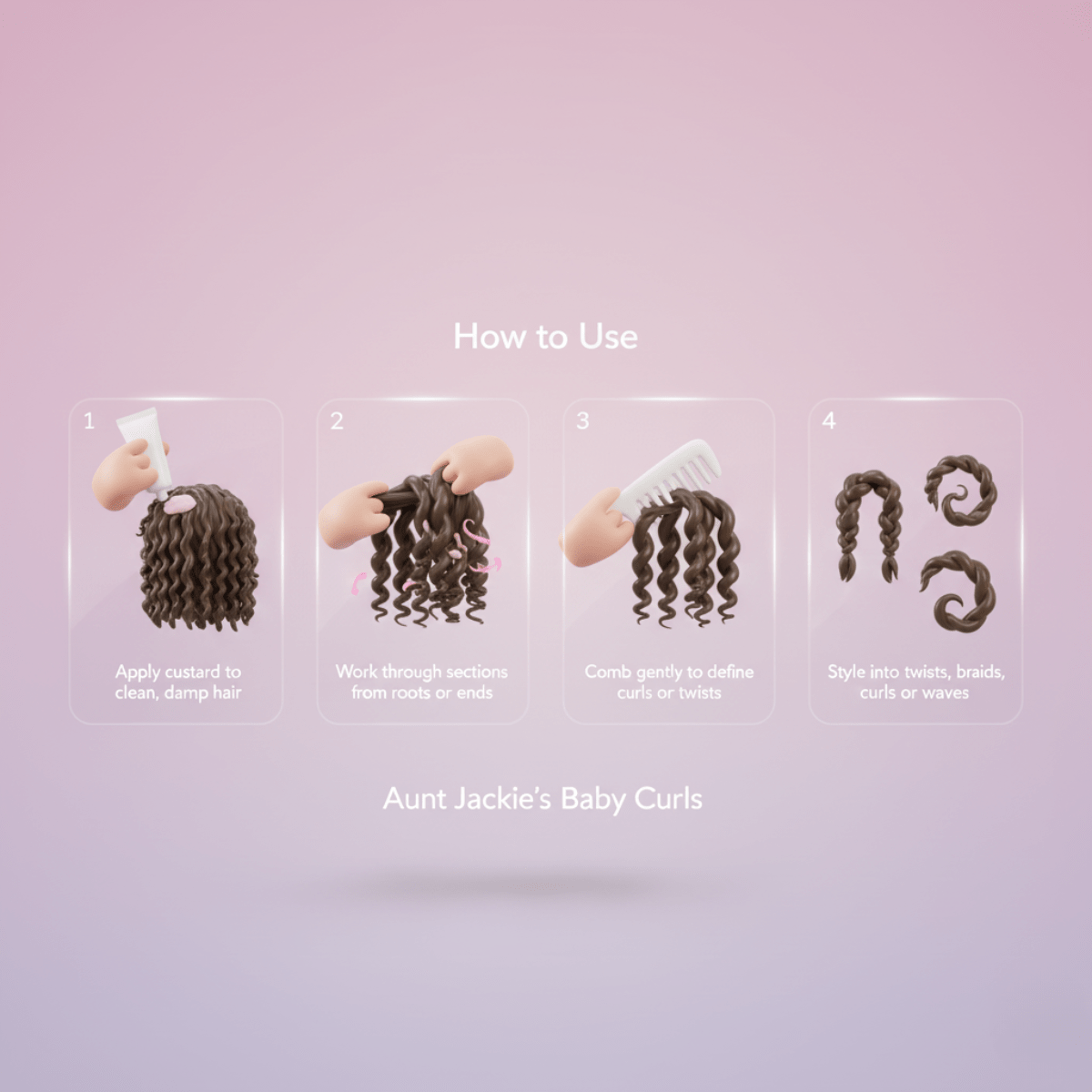 This moisture-rich custard adds definition to curls, waves, two-strand twists, braids, spirals and plaits. Aunt Jackie's Baby Curls Curling & Twisting Custard is designed to help natural curls, spirals and twists come to life. The moisture-rich custard defines curls, waves and two-strand twists.