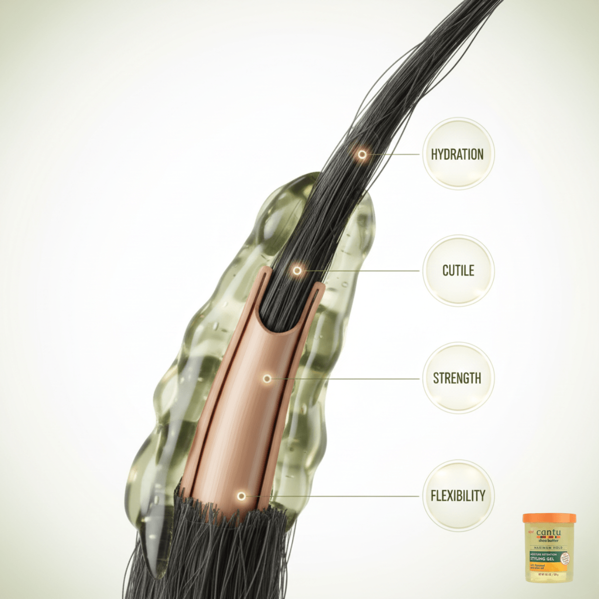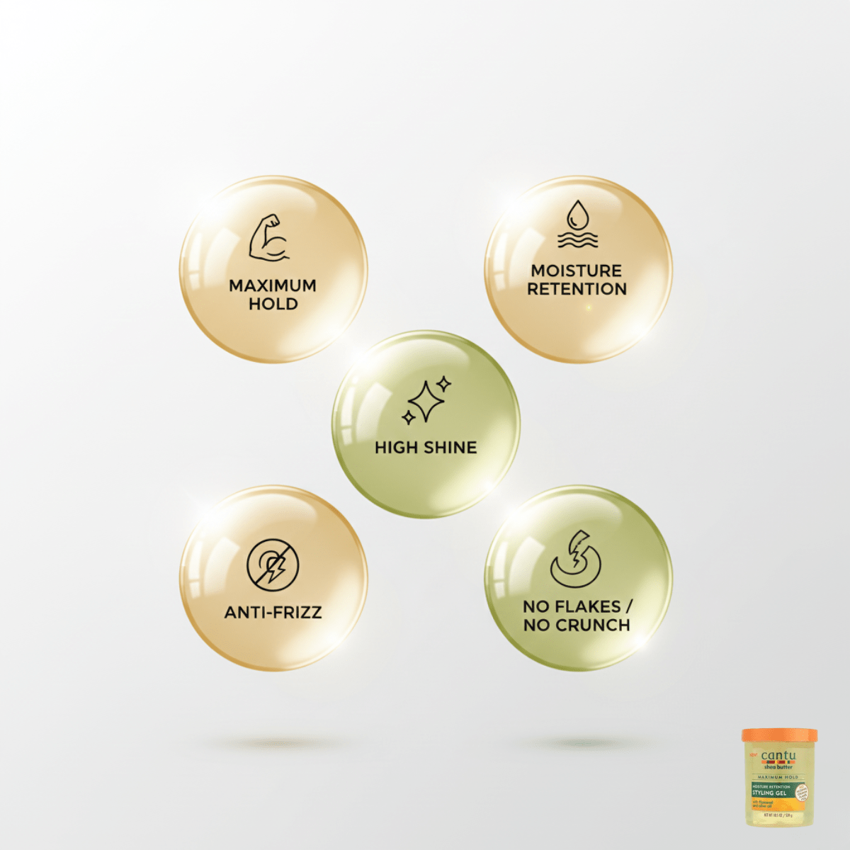 Cantu Shea Butter Moisture Styling Gel Flaxseed & Olive Oil adds definition, hold and shine by resisting humidity. Made with shea butter, flaxseed and olive oil, this alcohol-free gel keeps hair hydrated and nourished. It provides flexible hold without crunch or flakes. For best results, apply a moderate amount of styling gel to wet hair and style as desired.