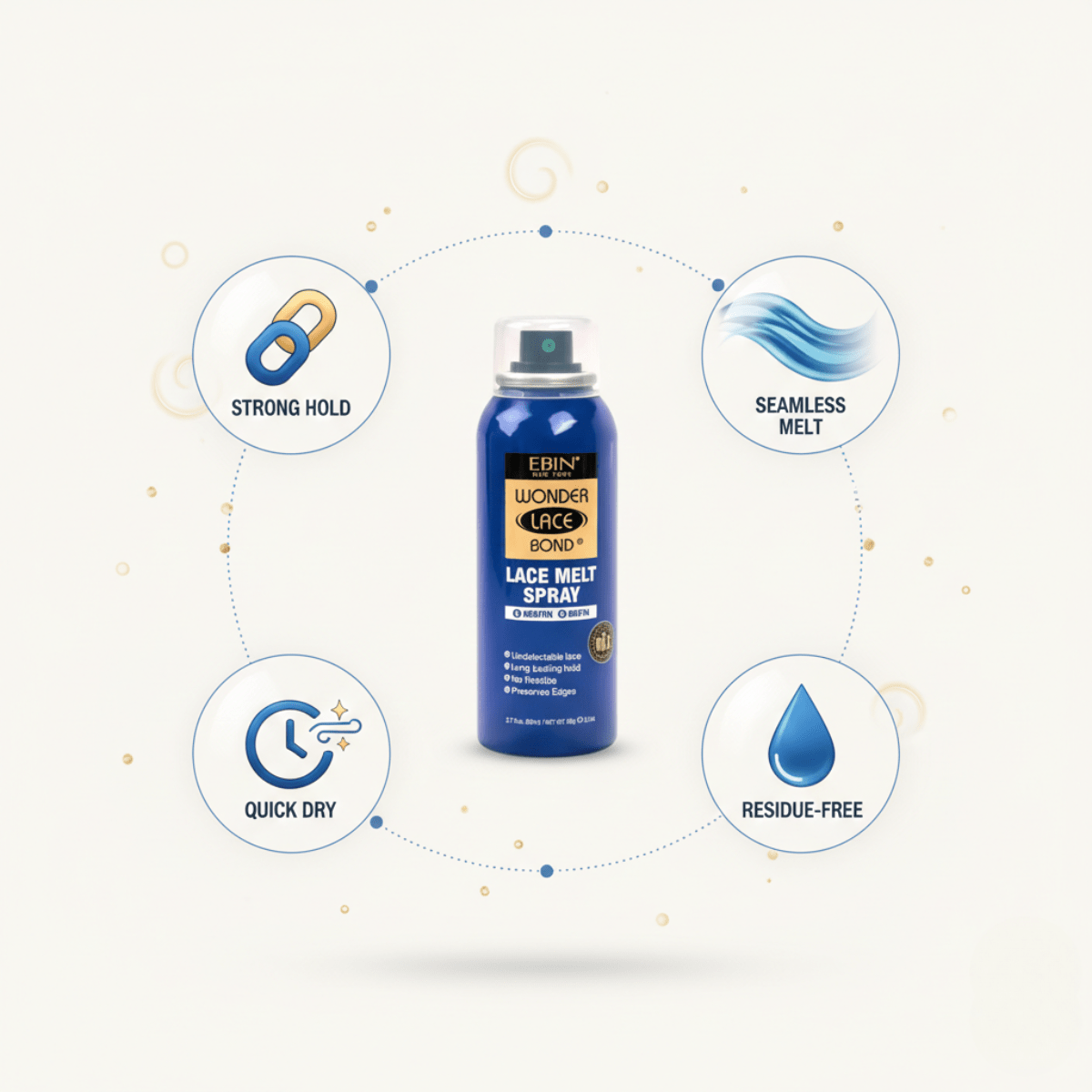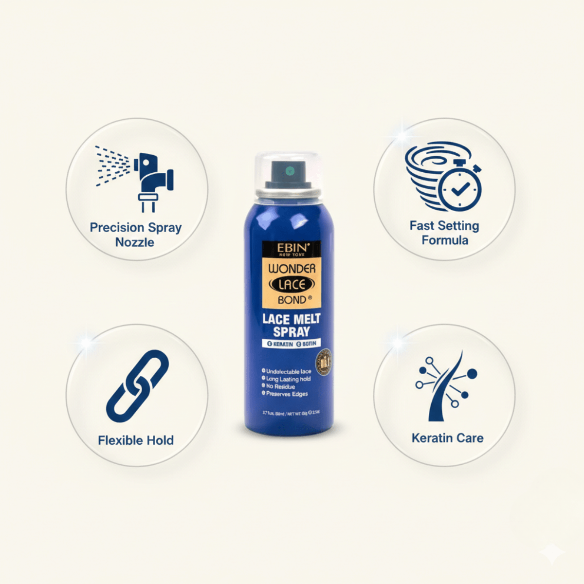 Das Ebin New York Wonder Lace Bond Lace Melt Spray – Keratin 80ml wurde entwickelt, um deine Lace-Wig in Sekunden unsichtbar mit deinem Haaransatz zu verschmelzen – und gleichzeitig deine Kanten intensiv zu schützen. Die einzigartige Melt-Formel mit Keratin, Vitamin E und Seidenprotein bietet nicht nur starken Halt, sondern auch eine luxuriöse Pflegewirkung, die deine Hairline glättet, stärkt und vor Trockenheit schützt.