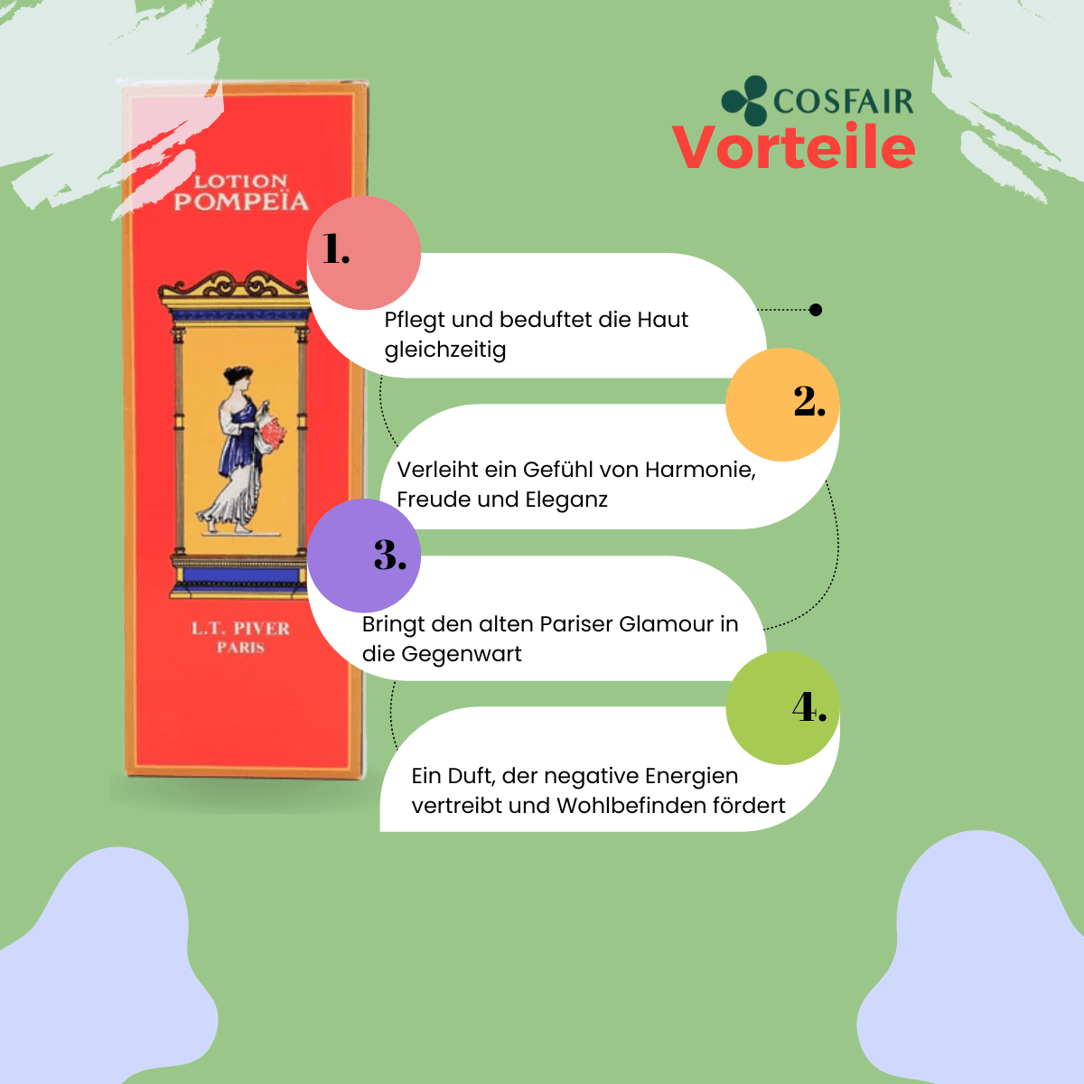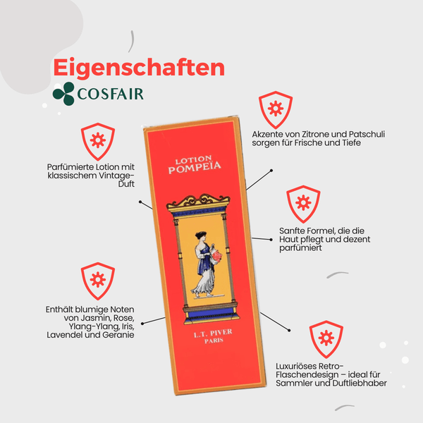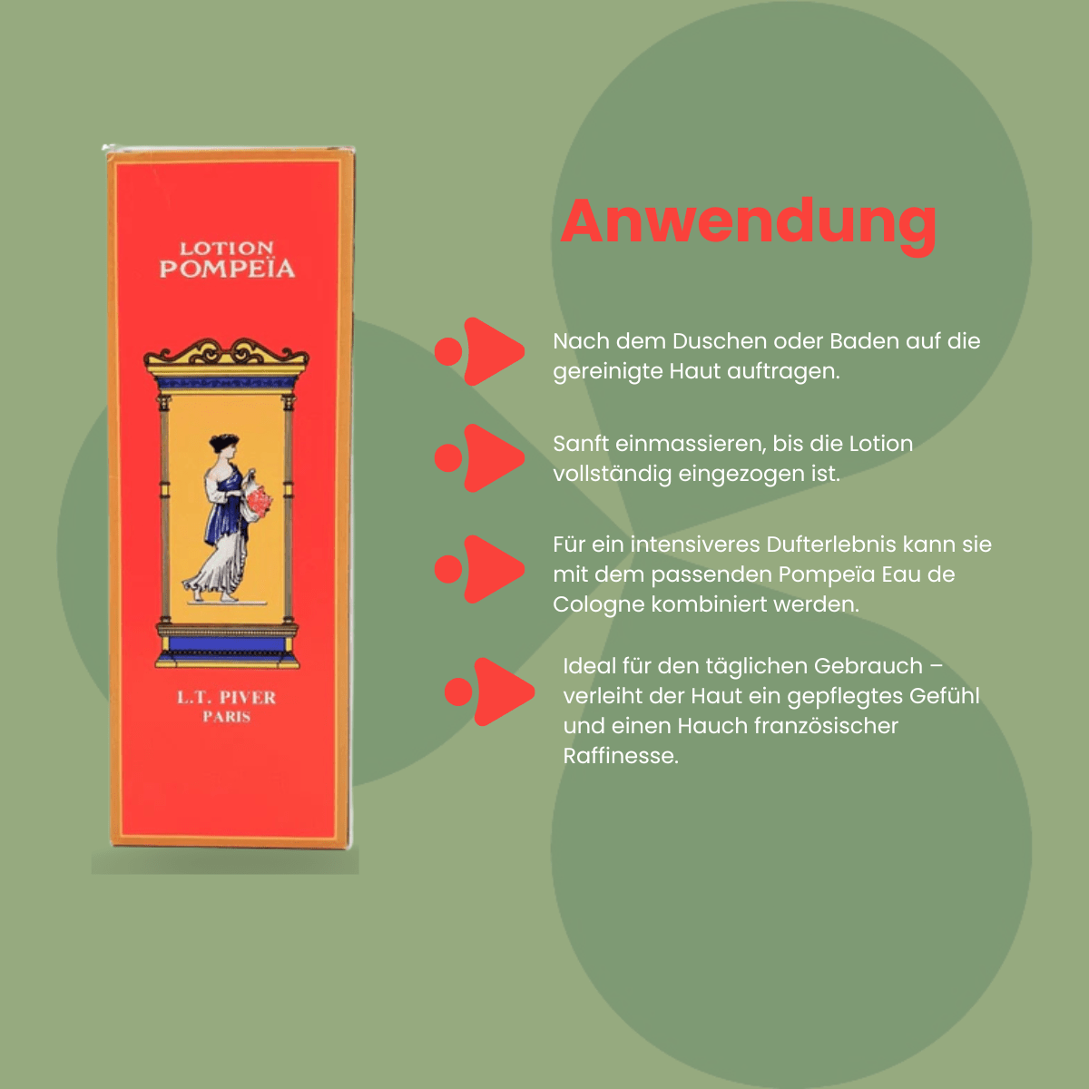 LT Piver Paris Lotion Pompeia Perfume 423ml, introduced since 1907, was created for LT Piver by perfumer Pierre Armingeat (1874-1955). Pompeïa was one of the first perfumes to use Amyl Salycilate, a synthetic substance discovered by Georges Darzens in 1896. With Darzens' support, Amyl Salycilate was previously used in LT Piver's Le Trèfle Incarnat, introduced since 1898.