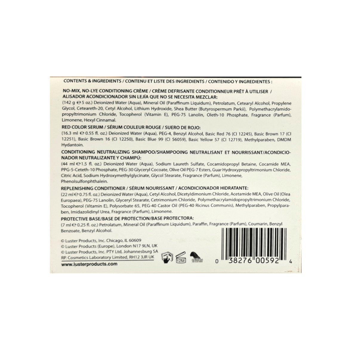 No-Mix, No-Lye Conditioning Relaxer Creme (5 oz. [142 g]): Deionized Water (Aqua), Mineral Oil (Paraffinum Liquidum), Petrolatum, Cetearyl Alcohol, Propylene Glycol, Lithium Hydroxide, Ceteareth-20, Cetyl Alcohol, Polymethacrylamidopropyltrimonium Chloride, Tocopherol (Vitamin E), PEG-75 Lanolin, DEA-Oleth-10 Phosphate.Fragrance (Parfum). Red Color Serum (0.55 fl oz [16.3 ml]): Deionized Water (Aqua), PEG-4, Benzyl Alcohol, Basic Red 76 (CI 12245), Basic Brown 17 (CI 12251), Basic Brown 16 (CI 12250), Basic Blue 99 (CI 56059), Basic Yellow 57 (CI 12719), Methylparaben, DMDM Hydantoin.