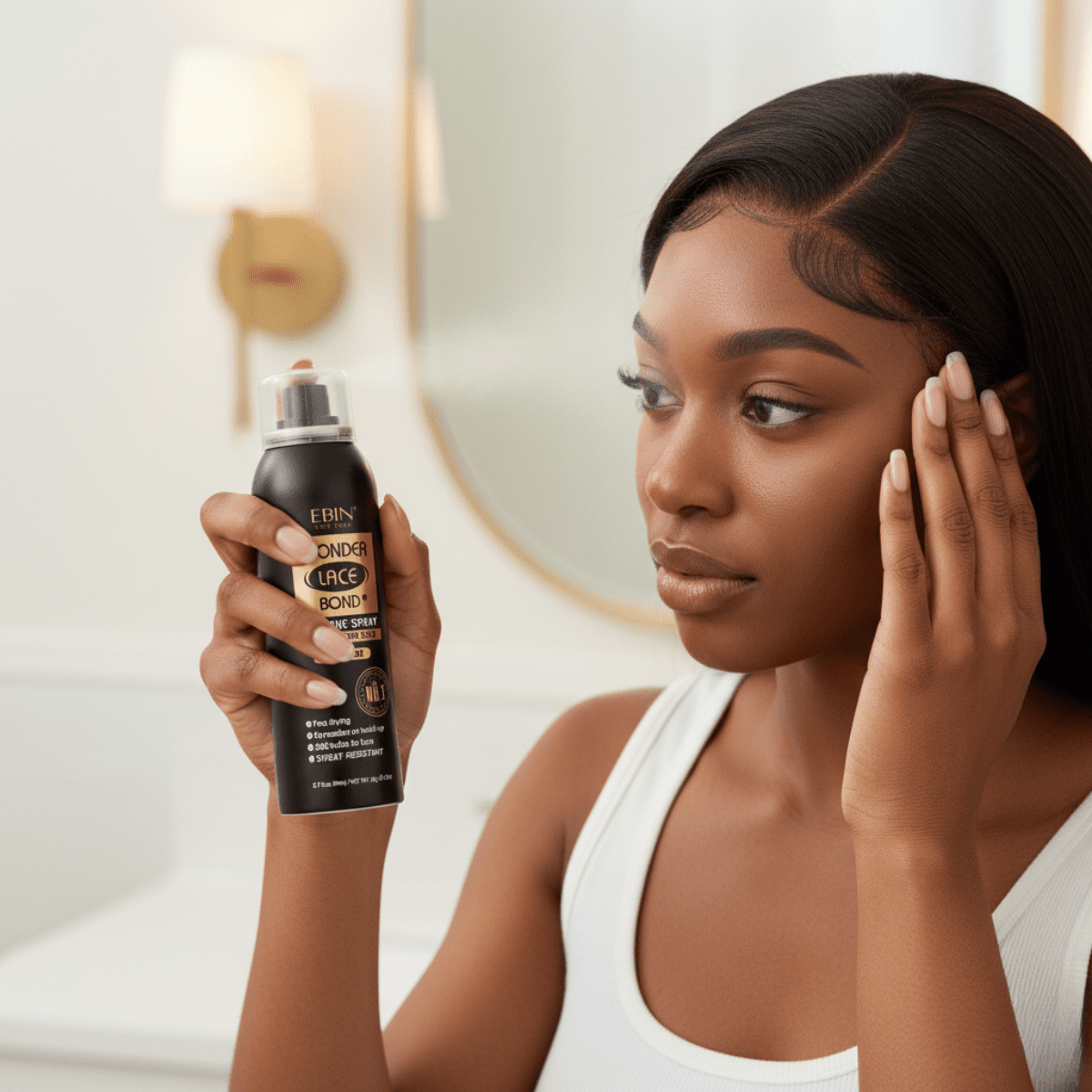 Ebin Adhesive Spray Firm Hold – ultra-starker Halt in Reisegröße. Schweißfest, vegan & präzise für makellose Lace-Front-Perücken. Ideal für unterwegs & schnelle Touch-ups.