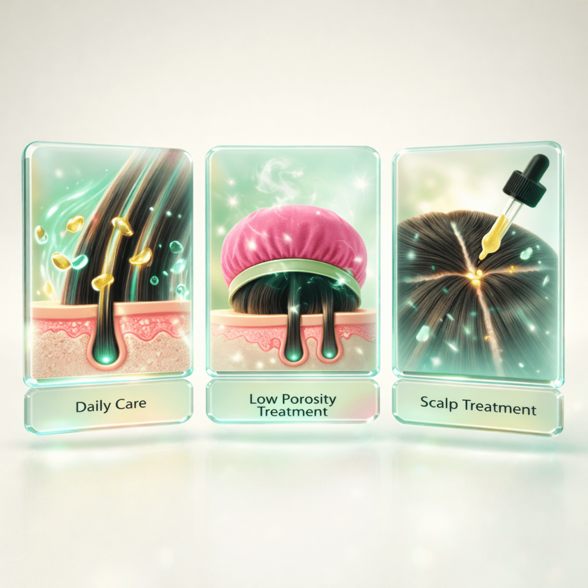 2️⃣ Low-Porosity-Treatment Öl einmassieren, Haube aufsetzen, 20 Min. einwirken lassen, danach mit Shampoo auswaschen.