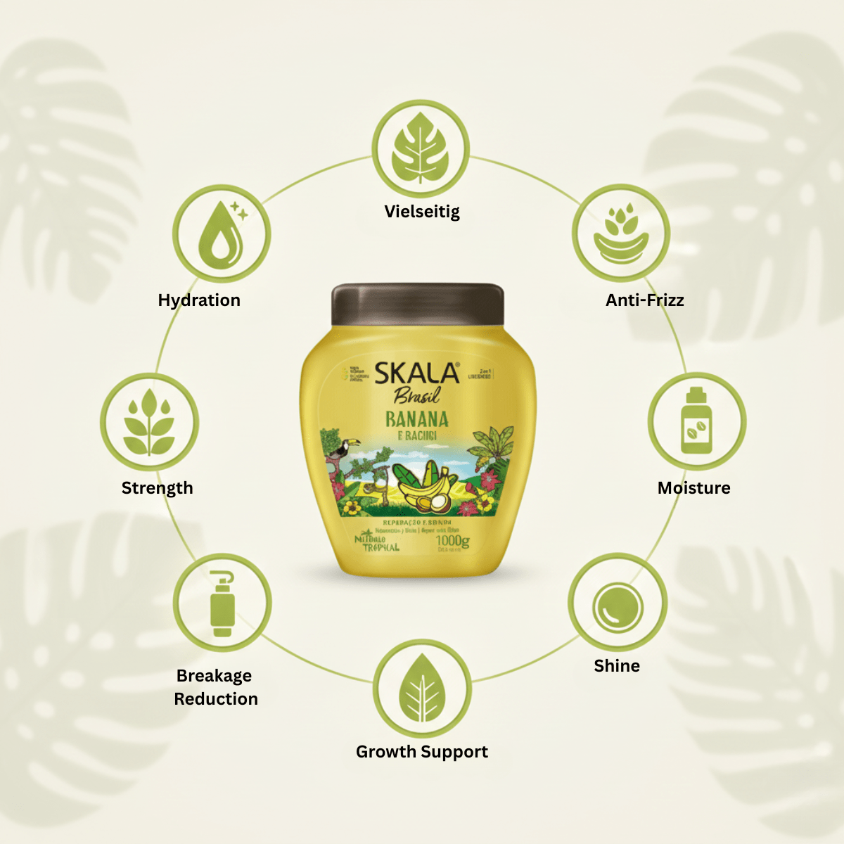Erlebe die tropische Kombination aus Banane und Bacuri, die dein Haar mit intensiver Feuchtigkeit, Nährstoffen und neuer Energie versorgt. Die SKALA Brasil Banana & Bacuri 2 in 1 Hair Cream wurde entwickelt, um selbst trockenes, sprödes oder frizzanfälliges Haar sofort zu transformieren – für geschmeidige, definierte und strahlende Strähnen.