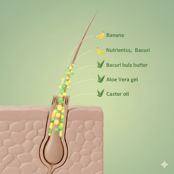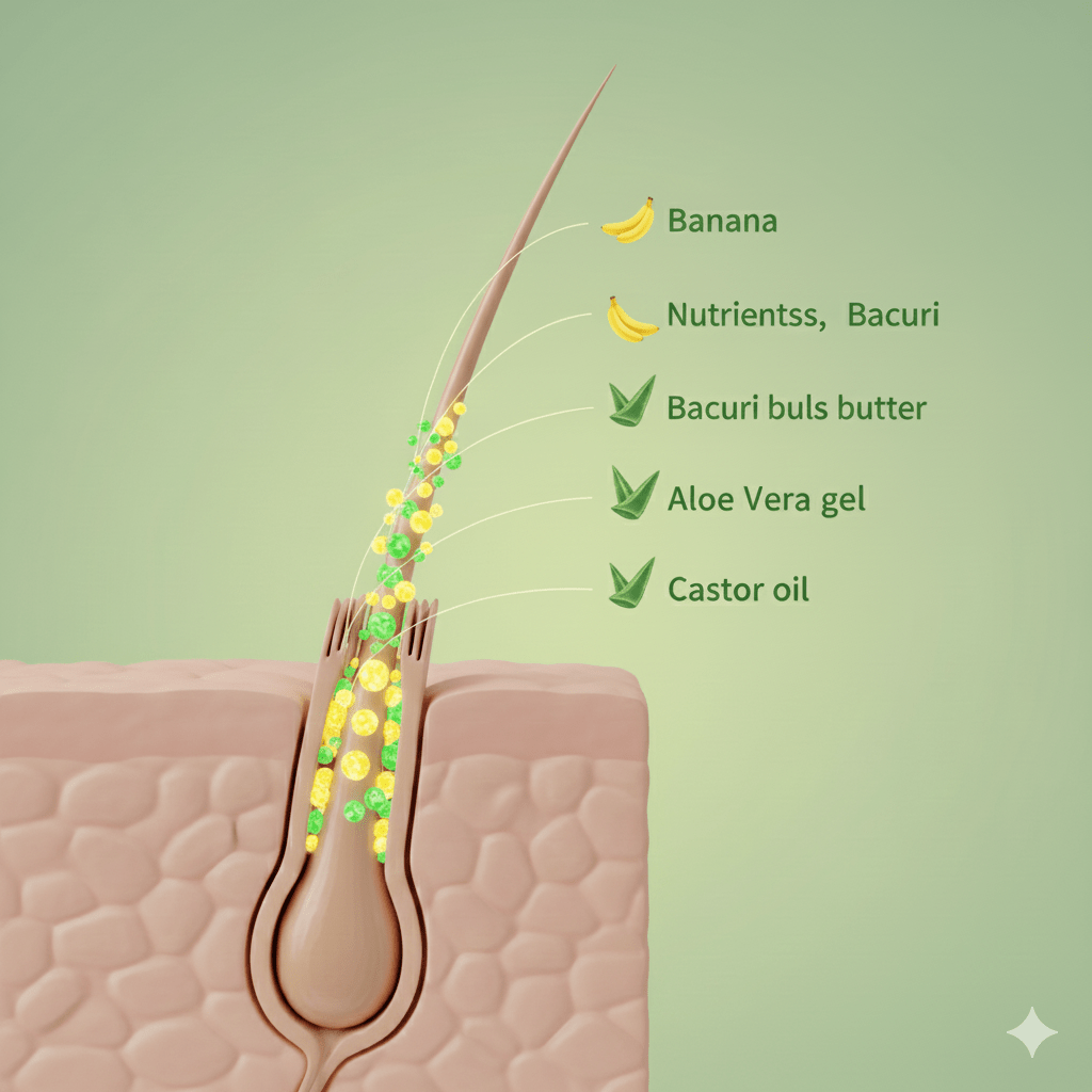 Banane spendet Feuchtigkeit und stärkt die Haarstruktur, während Bacuri-Butter deine Haare weich, glänzend und voller Energie macht. Aloe Vera und Rizinusöl unterstützen zusätzlich die Reparatur, fördern Haarwachstum und reduzieren Haarbruch – für gesundes, lebendiges Haar, das sich wunderbar weich anfühlt.
