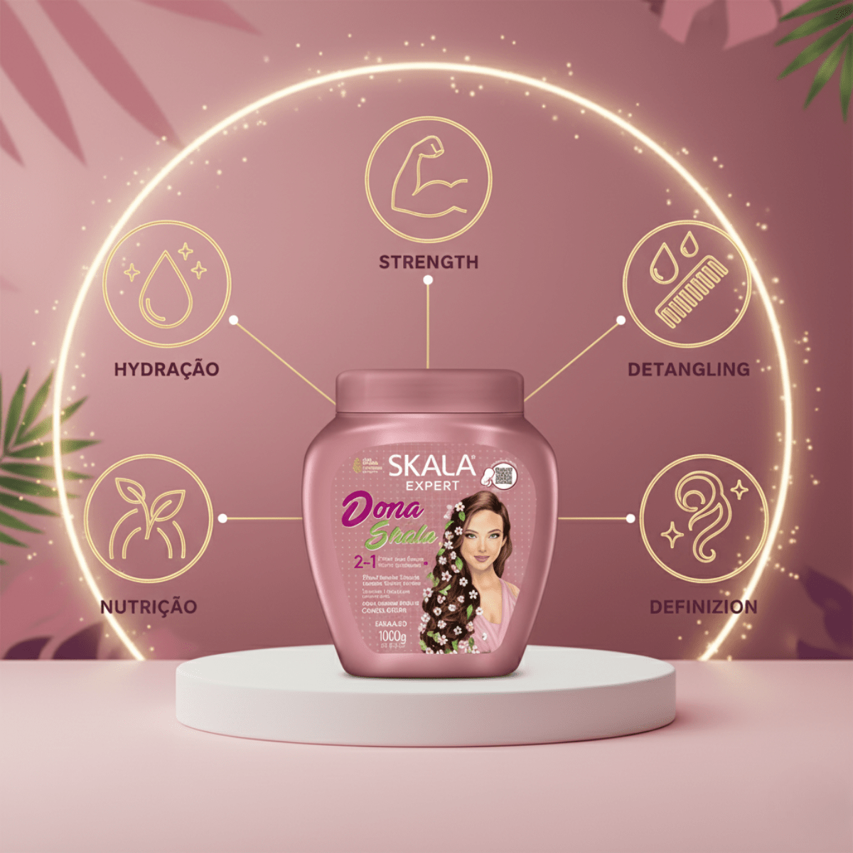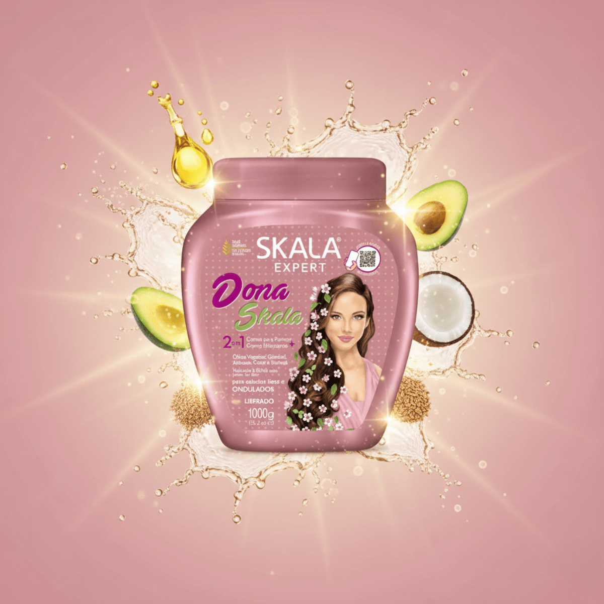 Erlebe die kraftvolle, vegane Pflegeformel, die dein Haar geschmeidig, glänzend und sichtbar revitalisiert. Die SKALA Expert Dona Skala 2 in 1 Hair Cream vereint hochwertige Pflanzenöle wie Sonnenblumenöl, Avocadoöl, Kokosöl und Leinöl und bietet deinem Haar intensive Nährstoffversorgung, Definition und natürliche Bewegung.