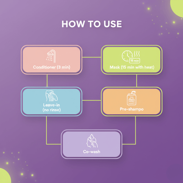 5️⃣ Als Co-Wash Auf nassem Haar Produkt auf die Kopfhaut geben, einmassieren, ausspülen. Etwas Produkt in die Längen geben, entwirren, erneut ausspülen.
