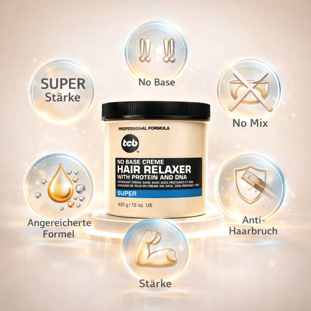 Geben Sie Ihrem Haar die intensive Glättung, die es verdient – mit dem TCB No Base Creme Hair Relaxer SUPER. Die hochwirksame Formel wurde entwickelt, um selbst stark gelocktes und krauses Haar dauerhaft zu entspannen, zu bändigen und in einen glatten, geschmeidigen & glänzenden Look zu verwandeln.