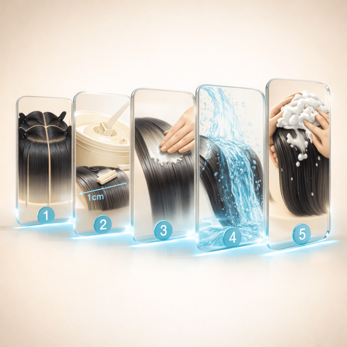 4️⃣ Neutralisierendes Shampoo auftragen, mehrfach waschen & vollständig ausspülen.